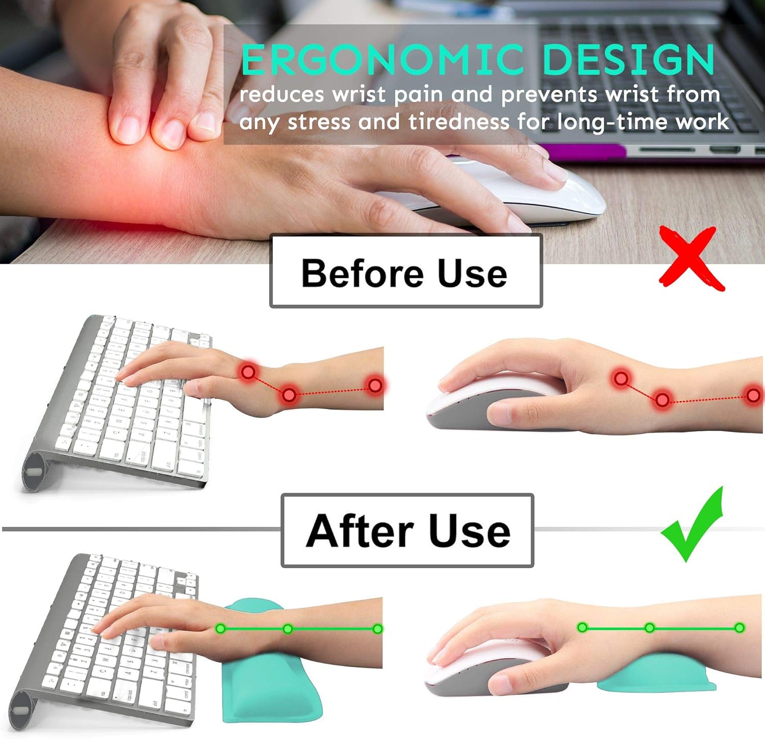 iFine Memory Foam Keyboard Wrist Rest Pad and Mouse Wrist Cushion Set provides good support to your wrist, maximum relief wrist stress and tiredness. Gaming keyboard wrist rest effectively avoid friction between the wrist and the desktop to prevent wrist from any hurts. Edges of our keyboard armrest are reinforced to endure long-time use. The soft cushion in PU Leather material conforms to your wrist for maximum comfortability. This cute wrist rest is waterproof and easy to clean by damp cloth, now we do not worry for any coffee spills. The grid-like rubber base pads of key board wrist wrest gives a grip on desk which provides typing and mouse pointer precision. The ideal enlarged size keeps your wrist in a neutral position for ergonomic comfort: Keyboard pad: 17(L)*3.5(W)*1(H) inch Wrist rest pad: 6.3(L)*3.5(W)*1(H)inch Wrist support tool combo fit most computers, notebooks, mouse, improves hand and wrist posture. Perfect wrist & hand fatigue reliever for workers, gamers, writers, editors who are engaged at long typing work. Available in 2 fashionable colors: Pink and Mint blue-green Package Inclusions: *1pc Keyboard Wrist Rest Pad *1pc Mouse Wrist Cushion