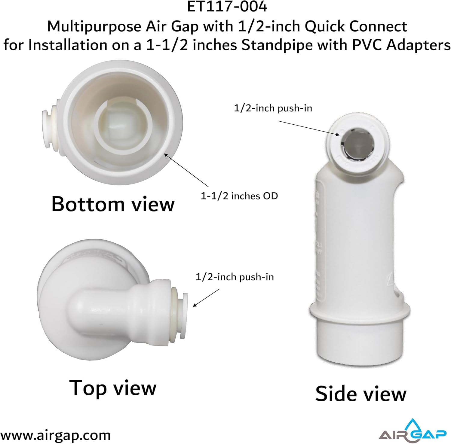 The ET117-004 multipurpose air gap is designed to provide a convenient way to install an air gap into a 1-1/2-inch standpipe drain. This air gap can be connected to a water filtration system using flex tubing. The air gap’s splash-resistant design protects the air gap’s surroundings from water damage. The inlet accommodates flex tubing for leak-proof installation in tight spaces. The right-angle inlet provides a convenient way of connecting discharge water tubing to a drain line. This air gap is easy to use and legal to install in any state. The ET117 series air gaps are UPC (Uniform Plumbing code) and IPC (International Plumbing Code) listed.