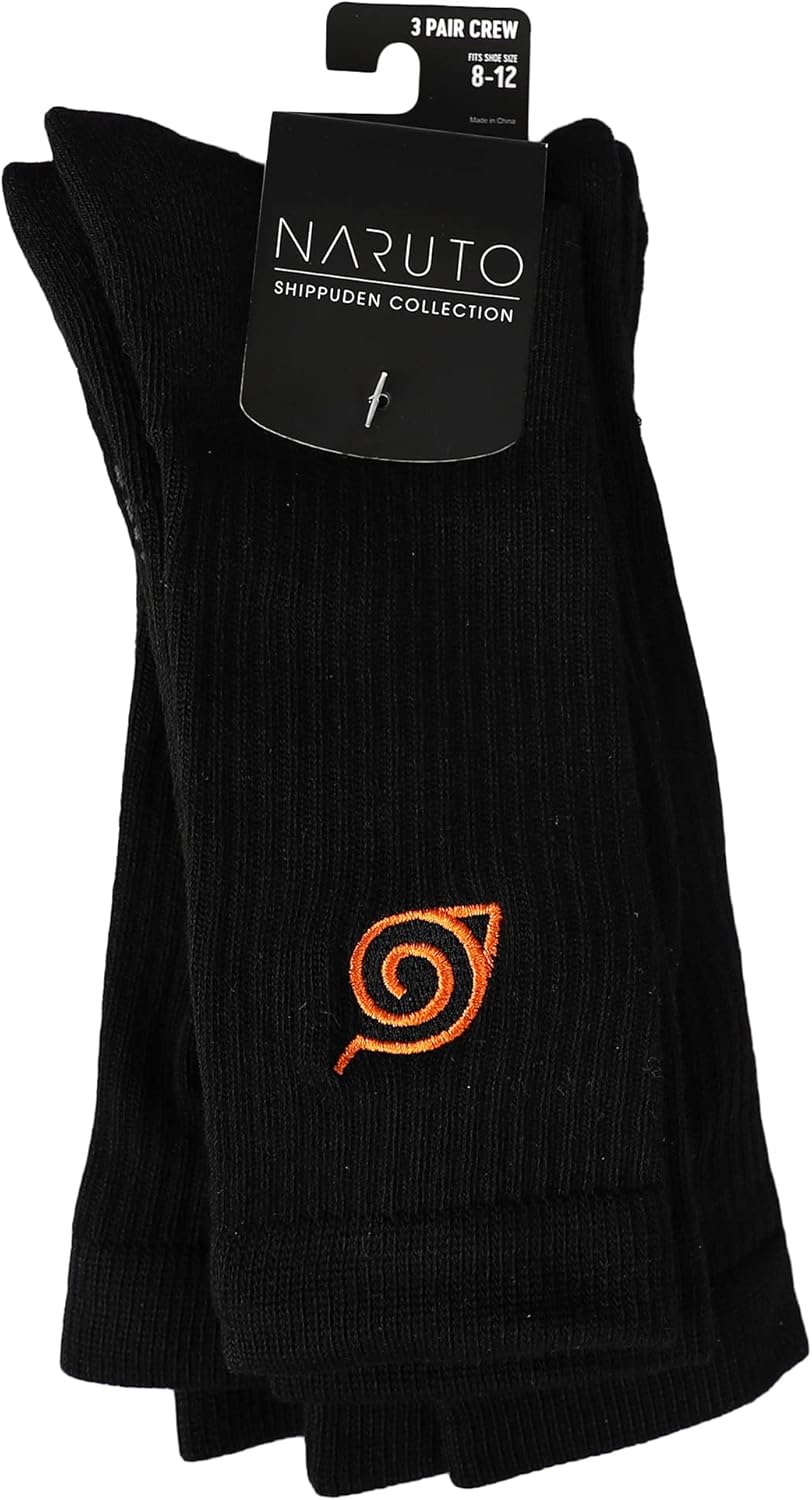 Show your love for your favorite anime cartoon, or gift these Naruto anime cartoon 3-pack athletic crew socks to a fan! The Naruto anime cartoon custom fan accessories are a 3-pack set of Naruto anime cartoon aathletic crew socks are made of polyester and spandex material and includes a well-cushioned footbed and arch compression for ultimate comfort. The Naruto anime cartoon black custom crew socks fan accessories feature custom designed symbols fromt he show on the ankle of each sock and the socks are able to fit mens sozk sizes 10-13 (shoe sizes 8-12.) The Naruto anime cartoon black athletic crew socks can be machine washed on cold with like colors and tumble dried on low for quick, easy care.