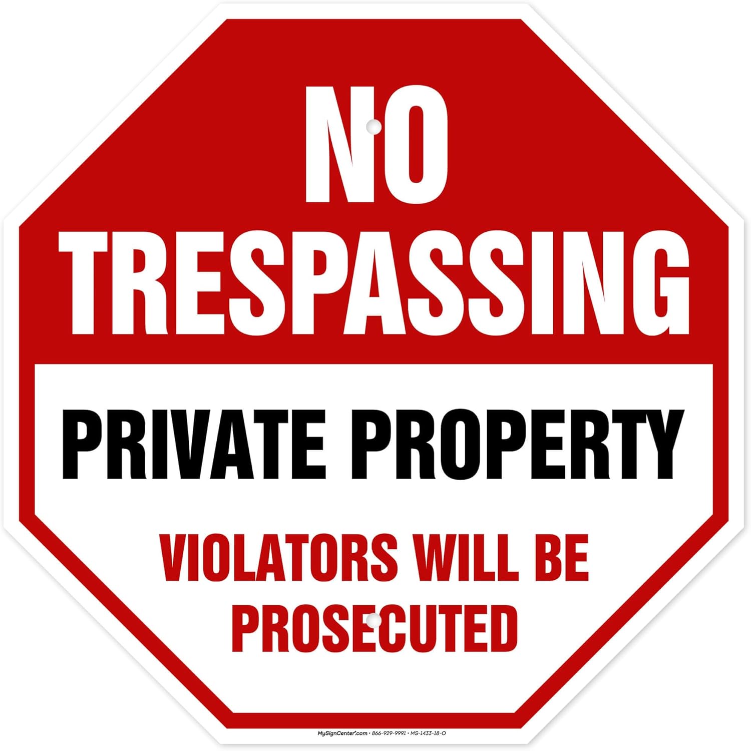 No Trespassing Private Property Violators Will Be Prosecuted Sign, (MS-1433) 18x18 Inches, 55 mil thick HDPE (high density polyethylene), Made in USA by My Sign Center
